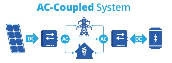 En AC coupling (courant alternatif) → la batterie est reliée après l’onduleur, du côté “maison”.